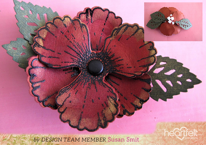 Step 1: Stamp the poppies using the versa-mark and black embossing powder. Stamp enough to make 5 X large, 1 X medium, 12 X small flowers. Each flower has 2 petal layers.