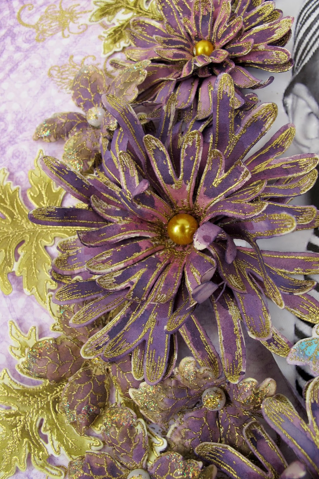 Another close up on the Mum finished with a gold pearl beed. Love how the distress inks blend...or don't. The close ups show how they work great together...love the richness. Don't forget, when the paper/card stock dries, it dries hard, so it keeps it's shape better.