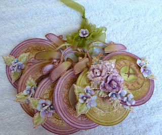 To make the three sentiment pages for this book:- Taking a pre-stamped and cut clock  and one of the sentiments, colour with the inks. One of these pages will be the book back page therefore adhere two of the extra card stock die cuts to the back of this page. This page does not have a journaling circle, the other two do. Adhere to the back of each page a collection design paper die cut. Taking the remaining two journaling circles and ink the edges then adhere these to the back of the clock pages. Adhere to each page a circle sentiment to cover the clock face. Trim away the clocks feet and the bell hammer. Apply the stickles to the fancy swirls and the edge of the sentiment circle, when this is dry, arrange and adhere the flowers and leaves in clusters as seen in the project photo.